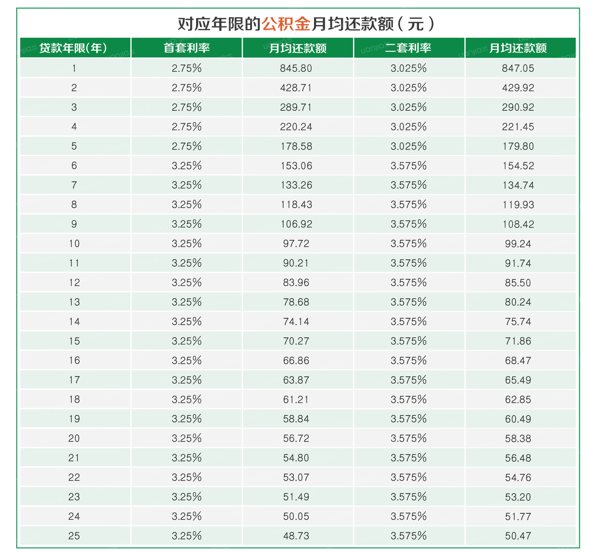 例:小王申请公积金贷款买首套房,若其贷款120万,25年,对应的月供是多少?