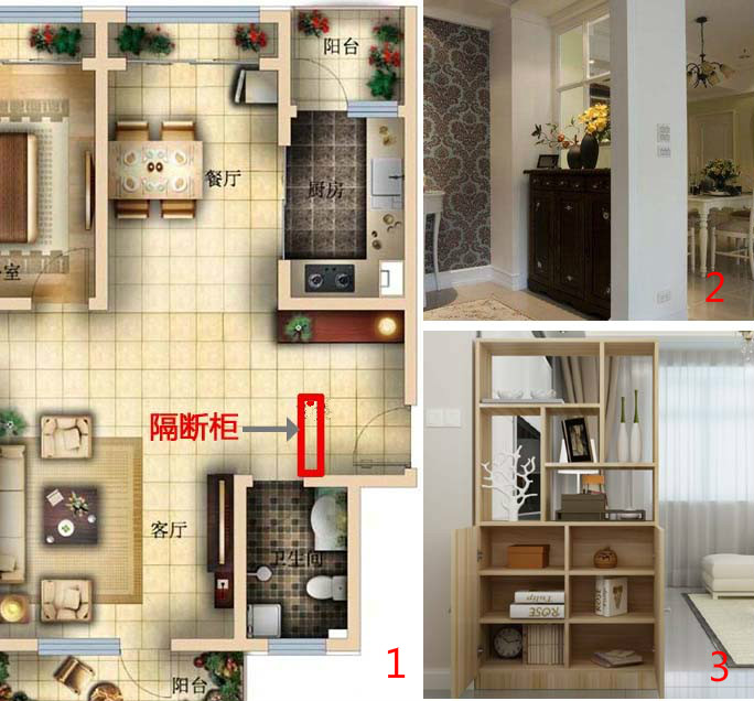 第一,让内室更有隐私感。如下图,在图1的户型中,开门就能看到内室居住者的一举一动,这样的居住体验是不是不够好呢?在这样的户型中,就需要在门口的位置做一个玄关柜以做隔挡,如图2与图3。